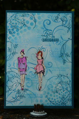 A birthday card for my friend. The ladies are colored with pencils, then masked to make the background with a stencil, stamps and inkt. In the inside of the card I used the same textstamps about friendship, here you can read them better.
